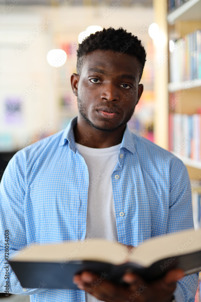 Serious young man in an academic setting, surrounded by books, embodying a pursuit of knowledge.