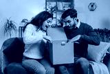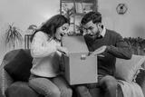 Happy excited Indian couple open cardboard box together sits on sofa at home. Diverse family consumers unpack good parcel looking inside giving high-five great purchase delivered by postal shipping.