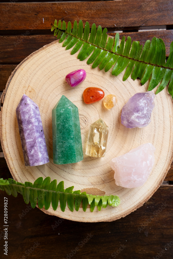 Healing crystals on brown background