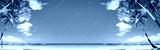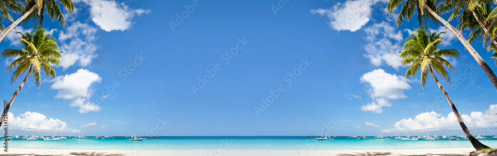 Tropical beach with coconut palm trees, white sand and turquoise sea. Travel concept. Long banner