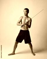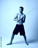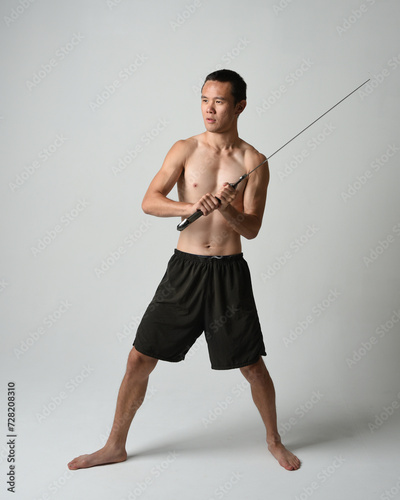 Full length portrait of fit handsome asian male model, wearing gym shorts and shirtless. Holding sword weapons whilst in warrior training action poses, isolated on white studio background.