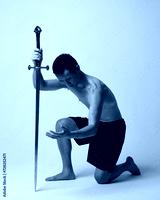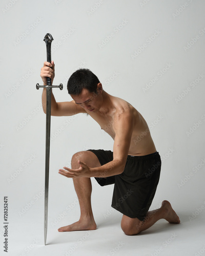 Full length portrait of fit handsome asian male model, wearing gym shorts and shirtless. Holding sword weapon, kneeling in warrior training action pose, isolated on white studio background.