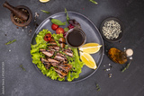 pieces of Organic grilled Tuna Steak on black ceramic serving dish with salad on a table