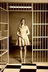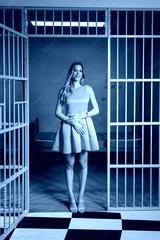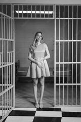 Doll like young woman in pink dress in pink prison room