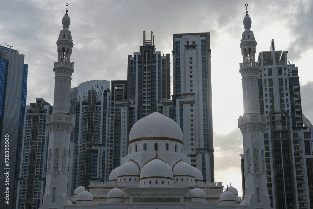 Futuristic and modern commercial and residential highrise tower skyscraper architecture with glass facades and clean lines in downtown Dubai, United Arab Emirates for millionaires and high society