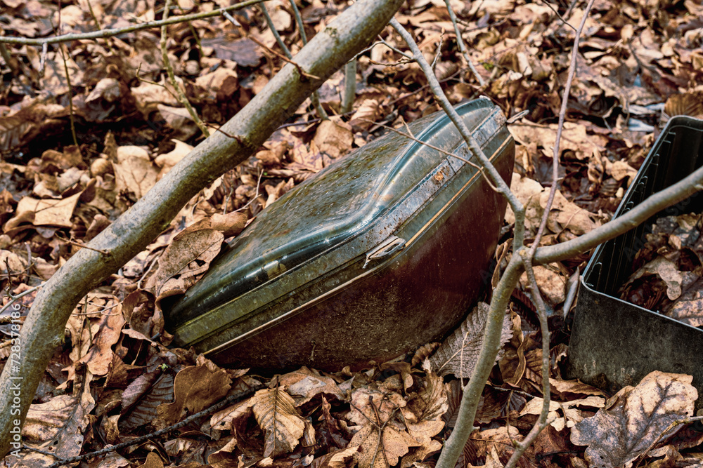 Broken Cathode Electron Beam Tube of Old TV, shattered television trash in the woods, littering in the forest, illegal landfill, forest pollution