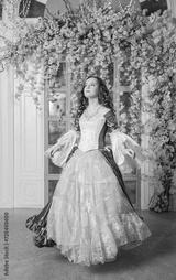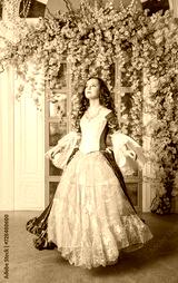 Young beautiful woman in fantasy rococo style medieval dress dancing looking up near door with pink flowers