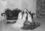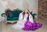 Young beautiful sad woman in fantasy white and purple rococo style medieval dress sitting near sofa