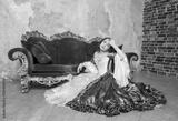 Young beautiful sad woman in fantasy rococo style medieval dress sitting on the floor near sofa