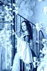 Beautiful woman in fantasy white and purple rococo style medieval dress standing on the stairway with pink flowers