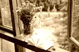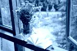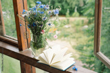 Beautiful summer still life on the windowsill. A bouquet of cornflowers and a book on the windowsill in a cozy home.