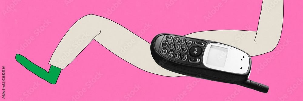 Banner. Contemporary art collage. Old cellular phone with stylized human legs against pink background. Concept of youth generation, Z culture, lifestyle, technology progress. Drawn style.
