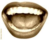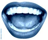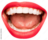 Open female mouth with white teeth, red lipstick isolated over transparent background. Laughing, happy, jokes. Concept of human emotions, face part, makeup, dental care