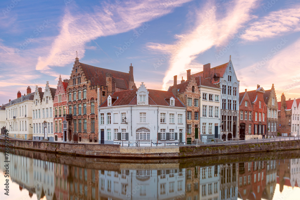 Scenic city view of Bruges canal, medieval houses and sunny bridge at sunset, golden hour, Belgium
