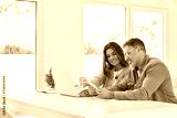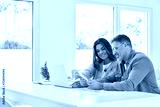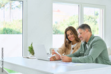 Happy middle aged couple mature man and woman calculating investments and financial expenses, money savings, paying bills online, using laptop computer sitting at home table in living room. Copy space