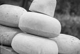 Blocks of yellow cheese with spices for sale on stall or in grocery shop