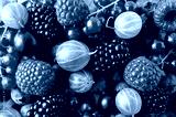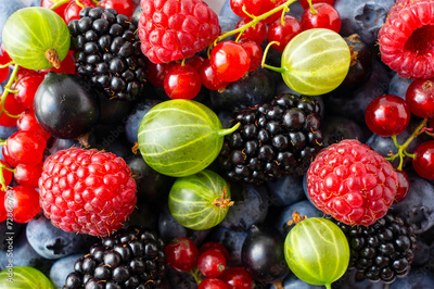 Background of fresh vegetables and fruits. Ripe blackberries, blueberries, raspberries, gooseberries and red currants. Mix berries and fruits. Top view. Background berries and fruits.
