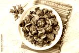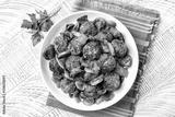 Plate with swedish beef meatballs with mushroom, parsley and gravy. Top view of a white wooden table.