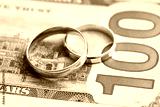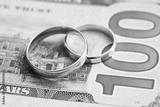 Wedding rings on money. Cost of wedding. Price of getting married background. Golden jewelry on banknote. Cash for getting divorced. Expensive marriage.