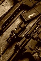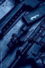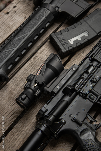A carbine with red dot sight. Weapons for police, special forces and the army. Modern automatic rifle on a wooden back