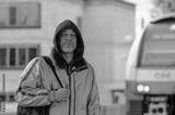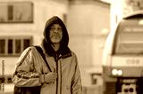 A man stands confidently in front of a train engine, capturing the essence of urban life and transportation.