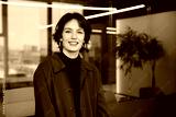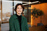 Confident young professional woman working in a modern office. Business trip woman posing for camera for business portraits in green shirt. A young marketing specialist inspired to work