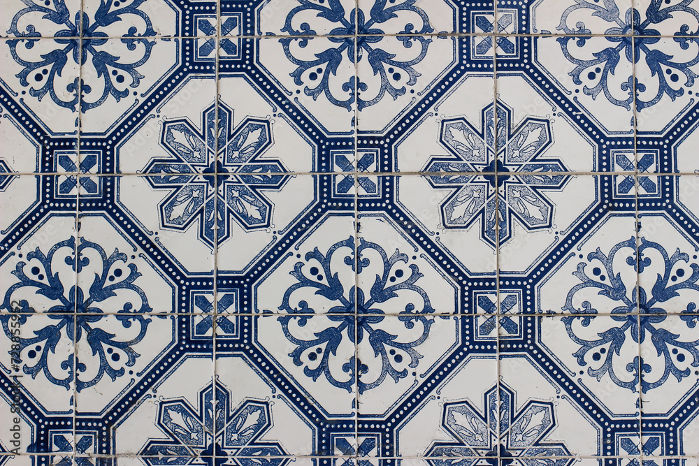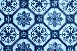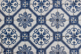 Blue traditional Portuguese ceramic tile pattern, azulejos. Beautiful shabby dirty facade, wall decoration of old Lisbon building, Portugal. Decorative background with geometric floral ornaments.