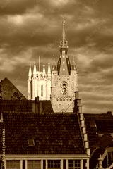 Aerial view of medieval buildings and towers of Old Town, Ghent, Belgium
