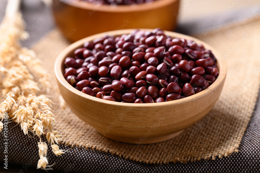 Red mung bean or Azuki bean in wooden bowl, Food ingredients