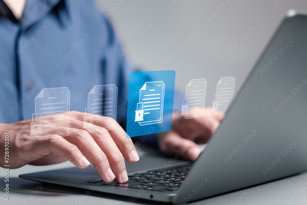 Corporate data management system concept. Businessman use laptop with virtual screen of Documents icon for document secure confidential access. Personal data and corporate personal data protection.