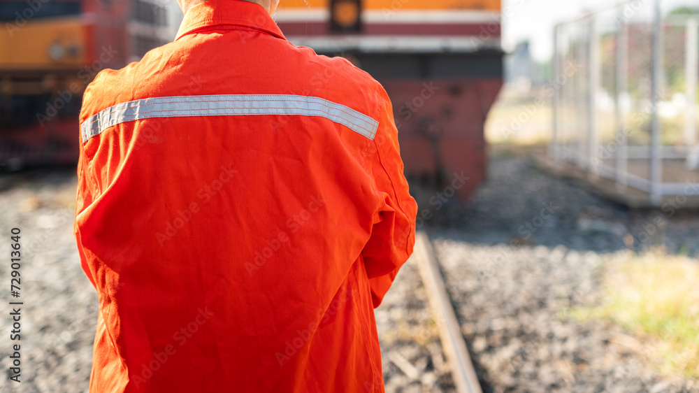 Close-up at back of a worker in safety uniform suit with reflection sight bar, standing on the train locomotive and railway track as background. Ready to working in transportation industrial concept.