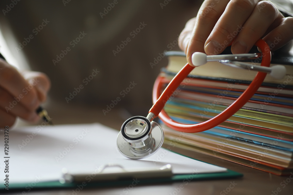 Male doctor search information in book and writtnig prescription, medical stethoscope on the desk at clinic. Medical knowledge and education concept.