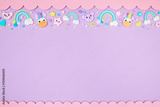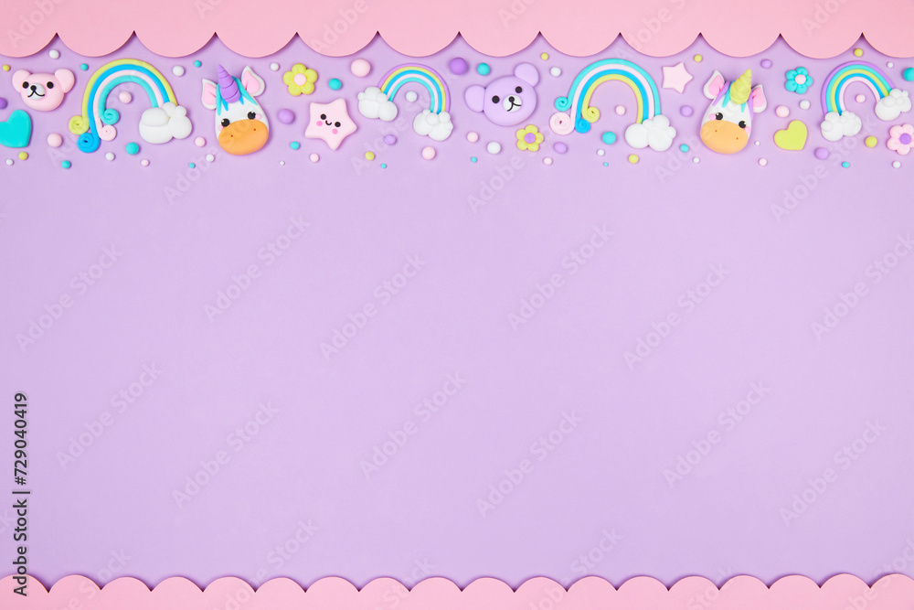 Trendy pastel purple kawaii banner background design template with cute air plasticine handmade cartoon animals, unicorns, stars, rainbows pattern. Top view, flat lay, copy space. Candycore, fairycore