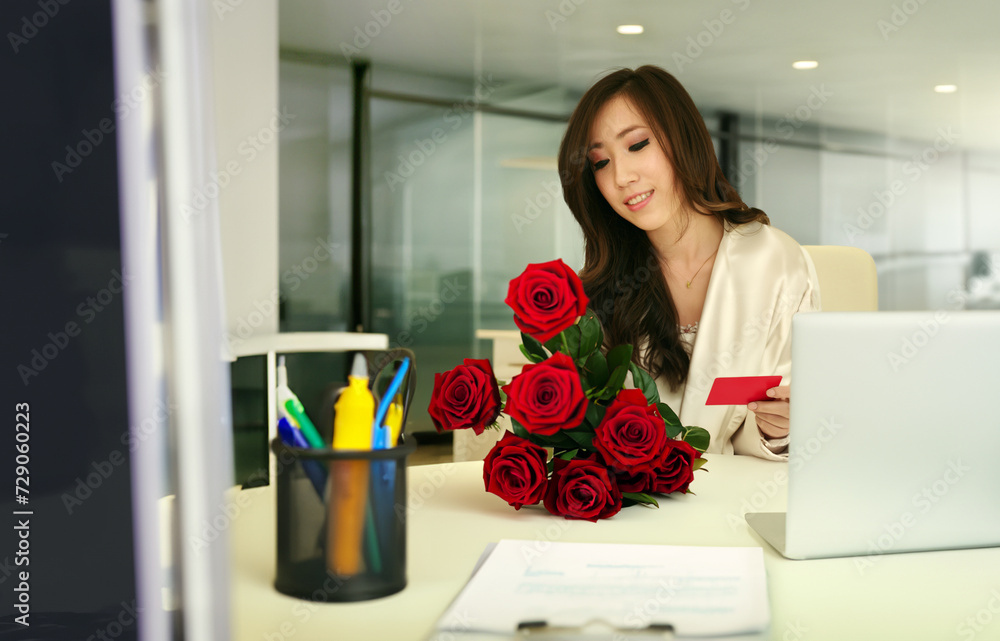 Smiling asian woman receives a bouquet of roses from a work colleague she secretly loves on Valentine's Day