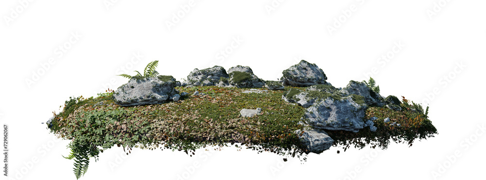 round surface patch covered with flowers, green leaf rock fern or dry grass isolated on white background. Realistic natural element for design. Bright 3d illustration.