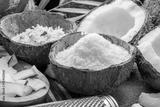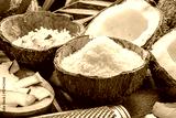 Fresh opened coconuts along with coconut slices, flakes and coconut leaves on a wooden table.