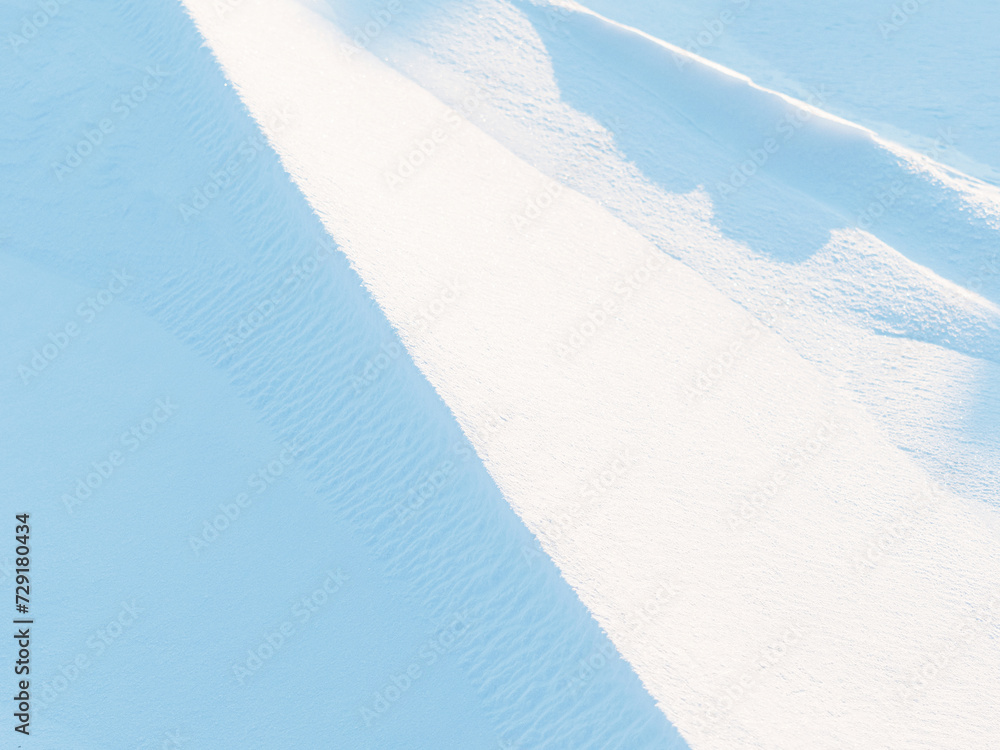 Snow texture. Wind sculpted patterns on snow surface. Wind in the tundra and in the mountains on the surface of the snow sculpts patterns and ridges (sastrugi). Arctic, Polar region. Winter background