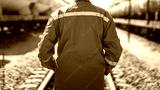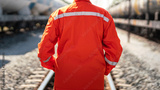 Close-up at back of a worker in safety uniform suit with reflection sight bar, standing on the train locomotive and railway track as background. Ready to working in transportation industrial concept.