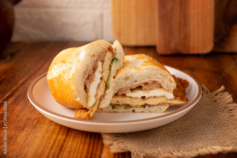 Mexican Torta de Milanesa. Sandwich made with bolillo bread, telera or baguette, split in half and filled with various ingredients, in this case breaded chicken meat with Oaxaca cheese.
