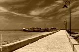 Fort San Sebastian and the stone breakwater bridge leading to it on a sunny day.