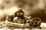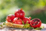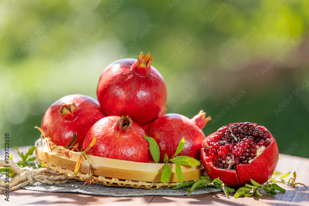 ชื่อ Pomegranate in wooden basket on wooden table in garden, Pomegranate with slices on blurred greenery background.