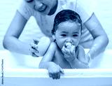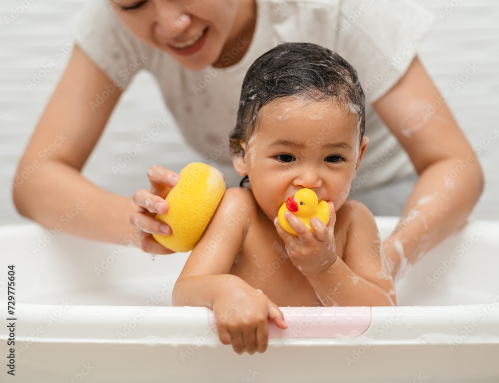 mother bathing her cheerful infant baby with a soft sponge with foam bubbles in bathtub