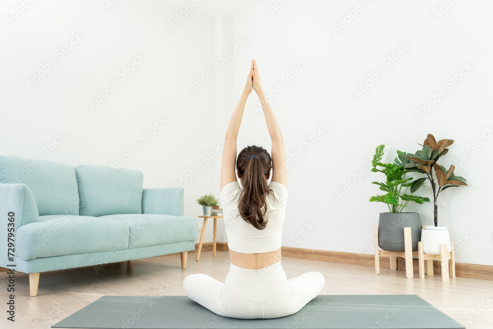Slim woman practicing yoga on room at condo or home. Asian woman doing exercises in morning. balance, meditation, relaxation, calm, good health, happy, relax, healthy lifestyle, diet, slim