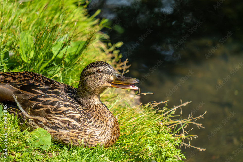 Duck on the lake shore in summer close-up.