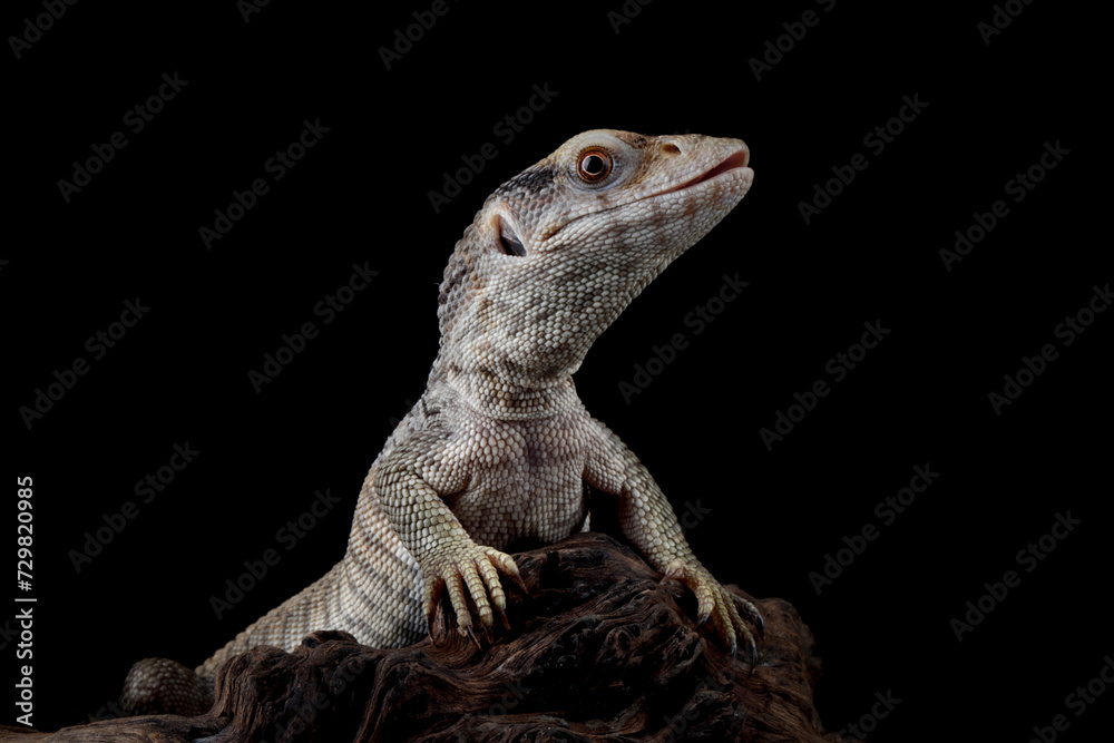 Savannah monitor (Varanus exanthematicus) closeup on isolated background, Savannah monitor closeup on wood
