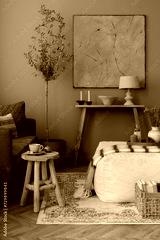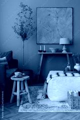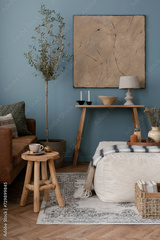 Interior design of rural style living room with white armchair, wooden shelf, olive tree, paintings, decorations and elegant accessories. Template. Blue wall.