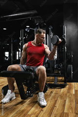 Young sports athlete fitness model, in the sports hall shakes biceps dumbbells portrait shot. Close-up Sports motivation, low key, high contrast. The concept of a healthy lifestyle, life movement