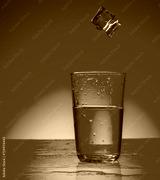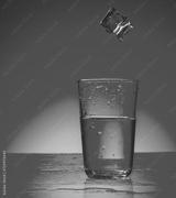 ice cubes falling into glass of water