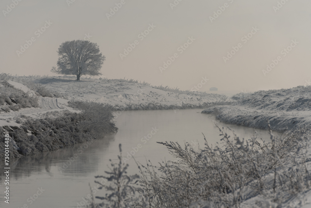 Frost-covered lonely tree on the river bank on a foggy winter day