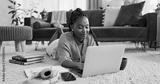 Laptop, education and a student black woman on the floor of a living room to study for a test or exam. Computer, smile and a happy young person learning with an online course for upskill development